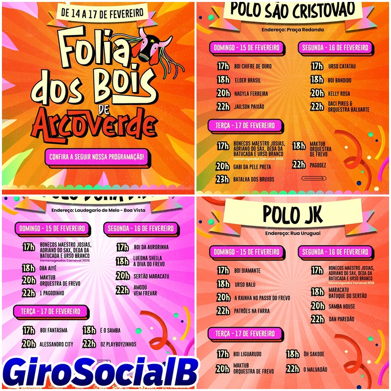 A festa continua entre os dias 15 e 17 de fevereiro, sempre a partir das 17h, nos polos JK, Dona Didi e São Cristóvão, levando a cultura popular para diversos bairros e fortalecendo a proposta de democratização do Carnaval.